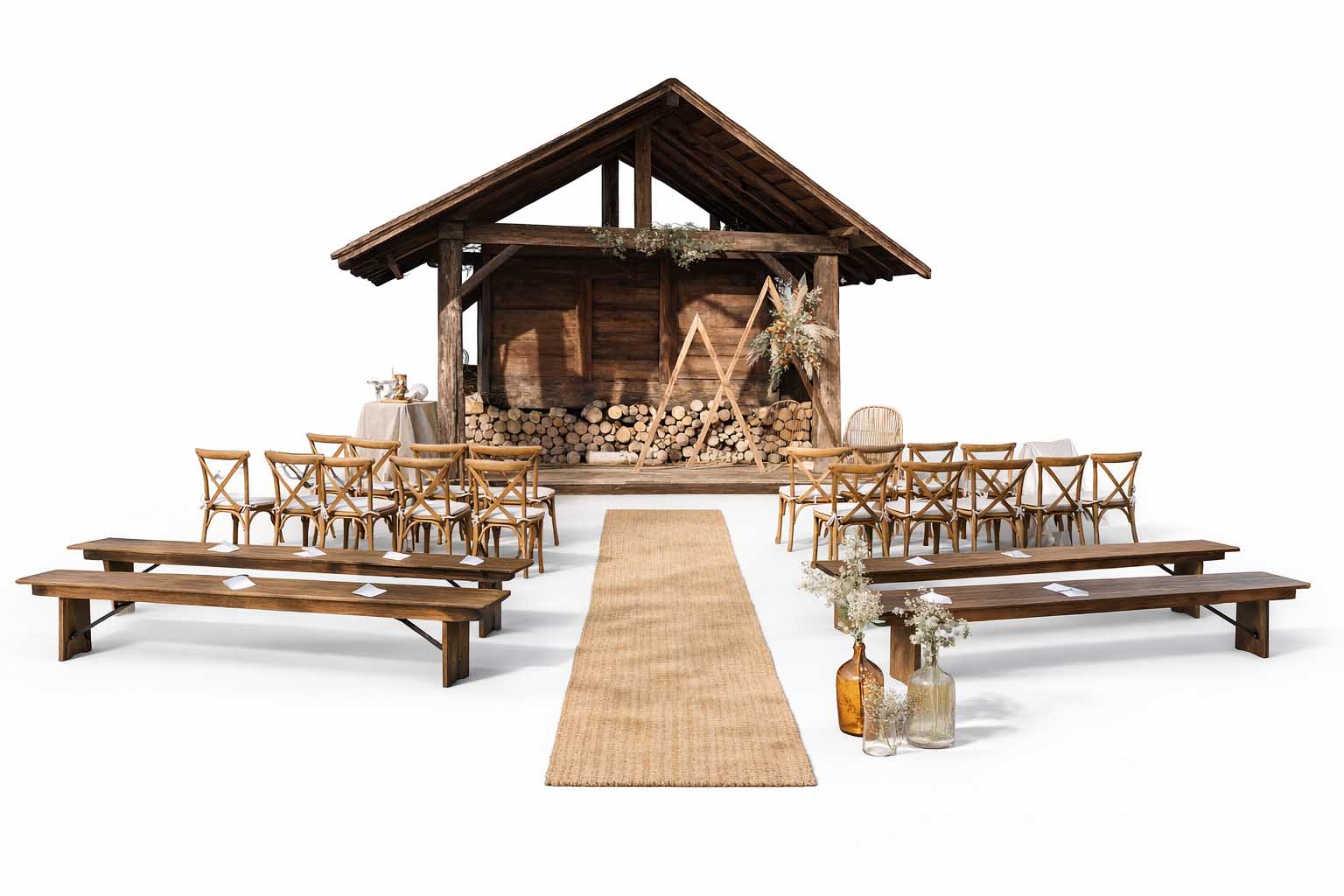 Nos bancs sont conçus pour un usage événementiel professionnel : bois massif, lignes sobres, stabilité irréprochable et rendu authentique, parfaitement adapté aux ambiances champêtres, élégantes ou naturelles.