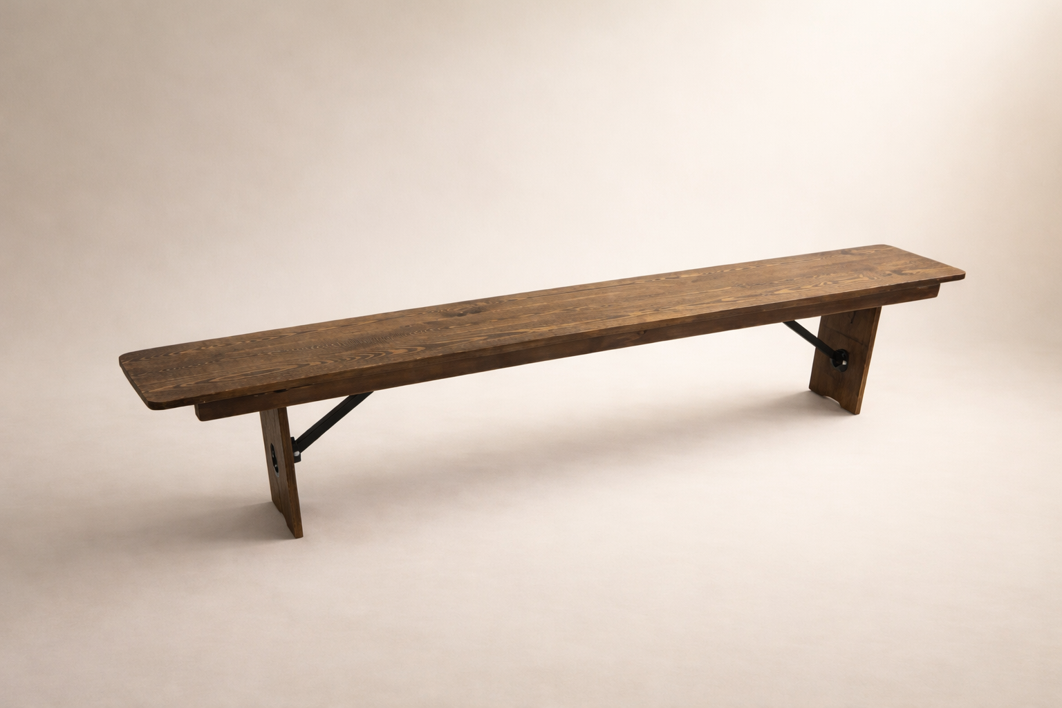 Banc pliant en bois massif verni, structure renforcée pour un usage événementiel intensif.