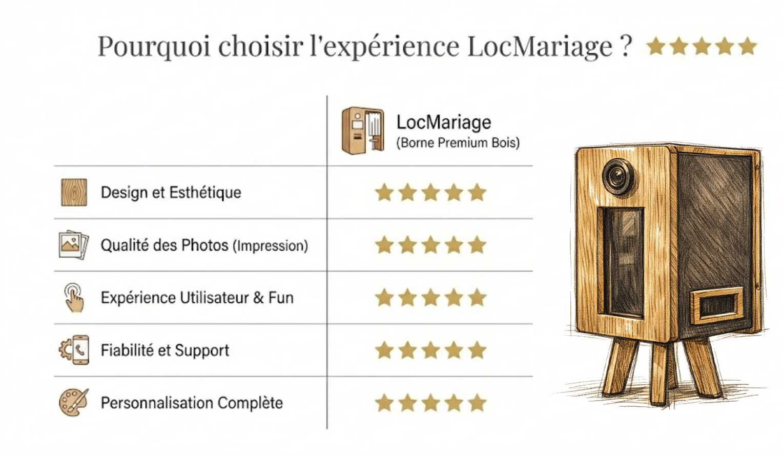 ⭐️ Chez LocMariage, nous proposons un photobooth haut de gamme, pensé pour les événements exigeants : qualité photo professionnelle, utilisation simple et fluide, impressions rapides et rendu esthétique à la hauteur de votre réception. Chaque installation est anticipée pour garantir une expérience sans stress, du premier au dernier cliché.