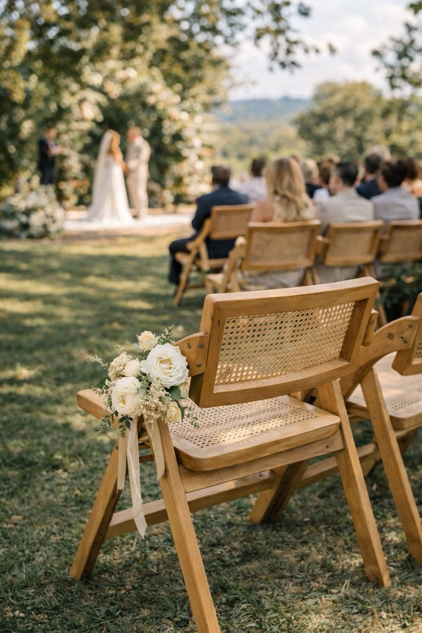 Les chaises sont livrées avec la structure en rotin, assurant un confort optimal pour les invités, aussi bien lors des cérémonies que pendant les repas prolongés.