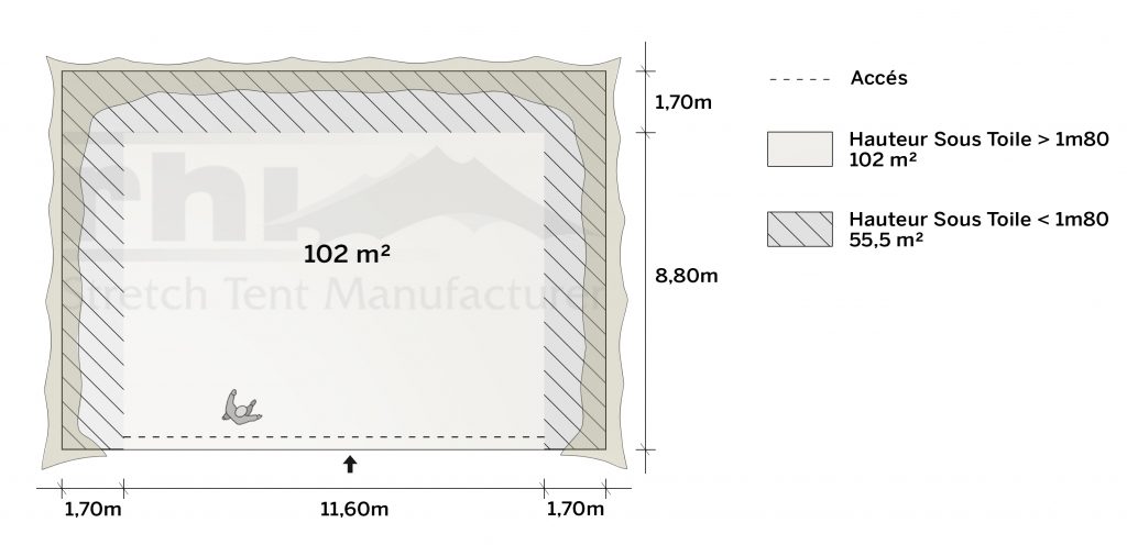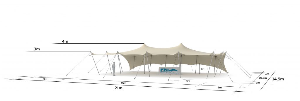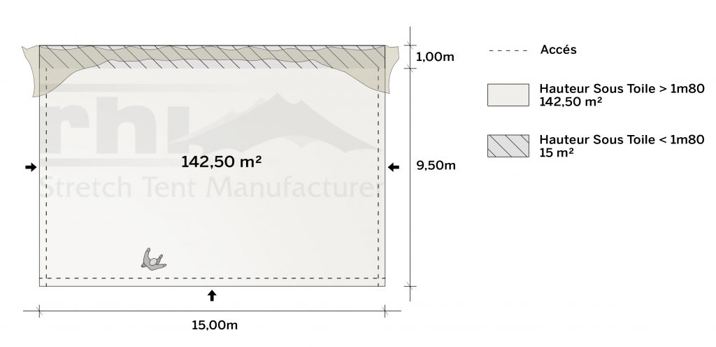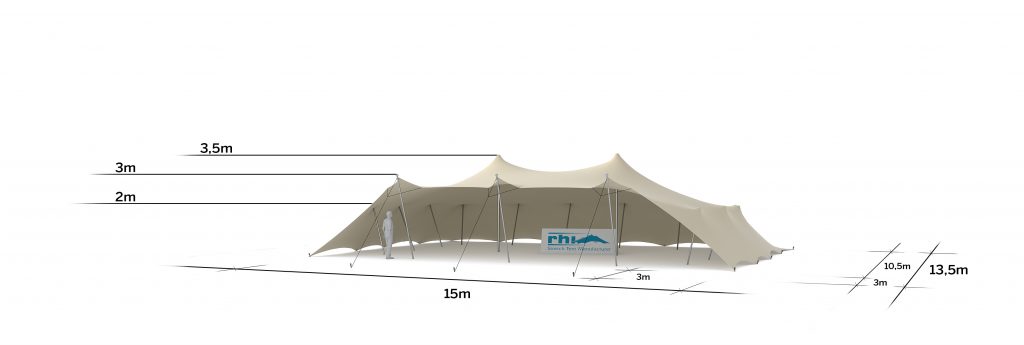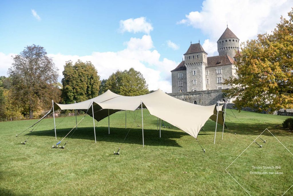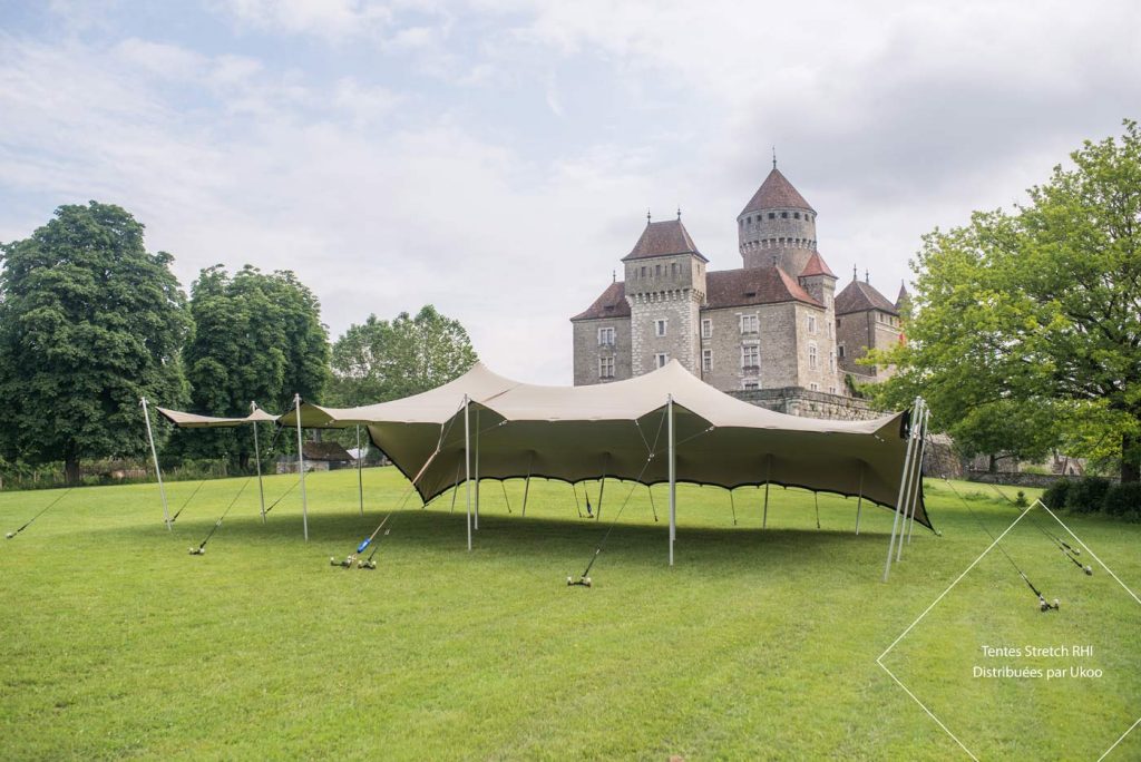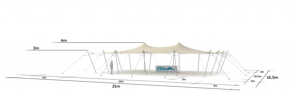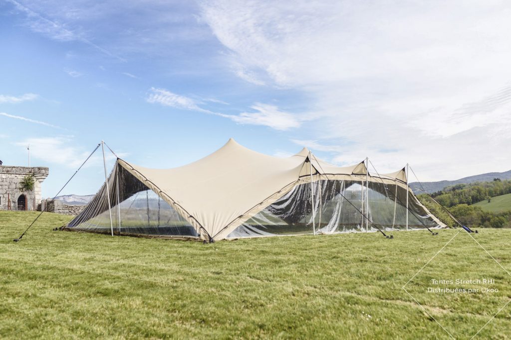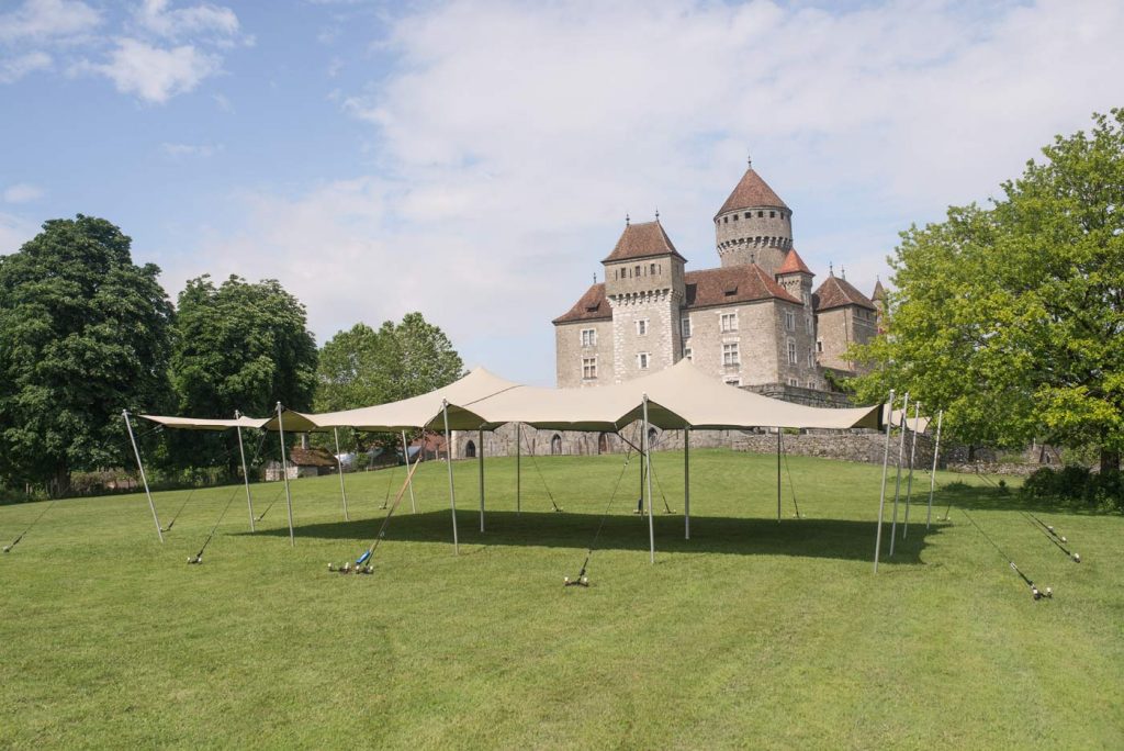 Dans le cas d'une impossibilité d'ancrer la tente, nous utilisons le lestage. (2 tonnes dans un angle, et de 1 tonne par encrage sur un côté.)